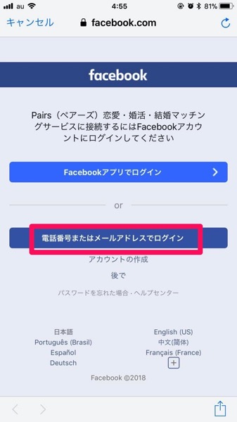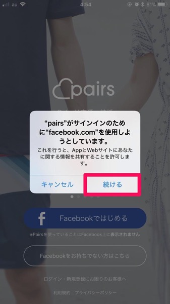 Pairsのアプリを立ち上げたら「Facebookではじめる」を押します。