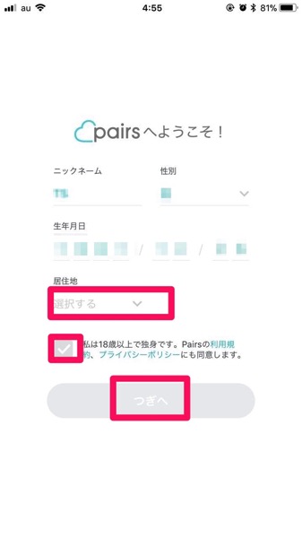「Pairsへようこそ」の画面が出ます。