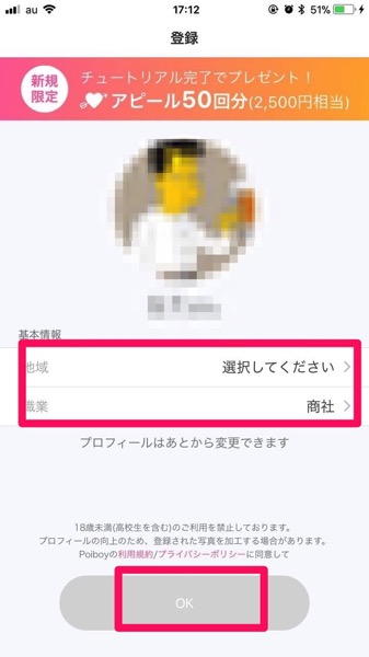 Poiboyユーザーに見せるプロフィールを入力していきます。